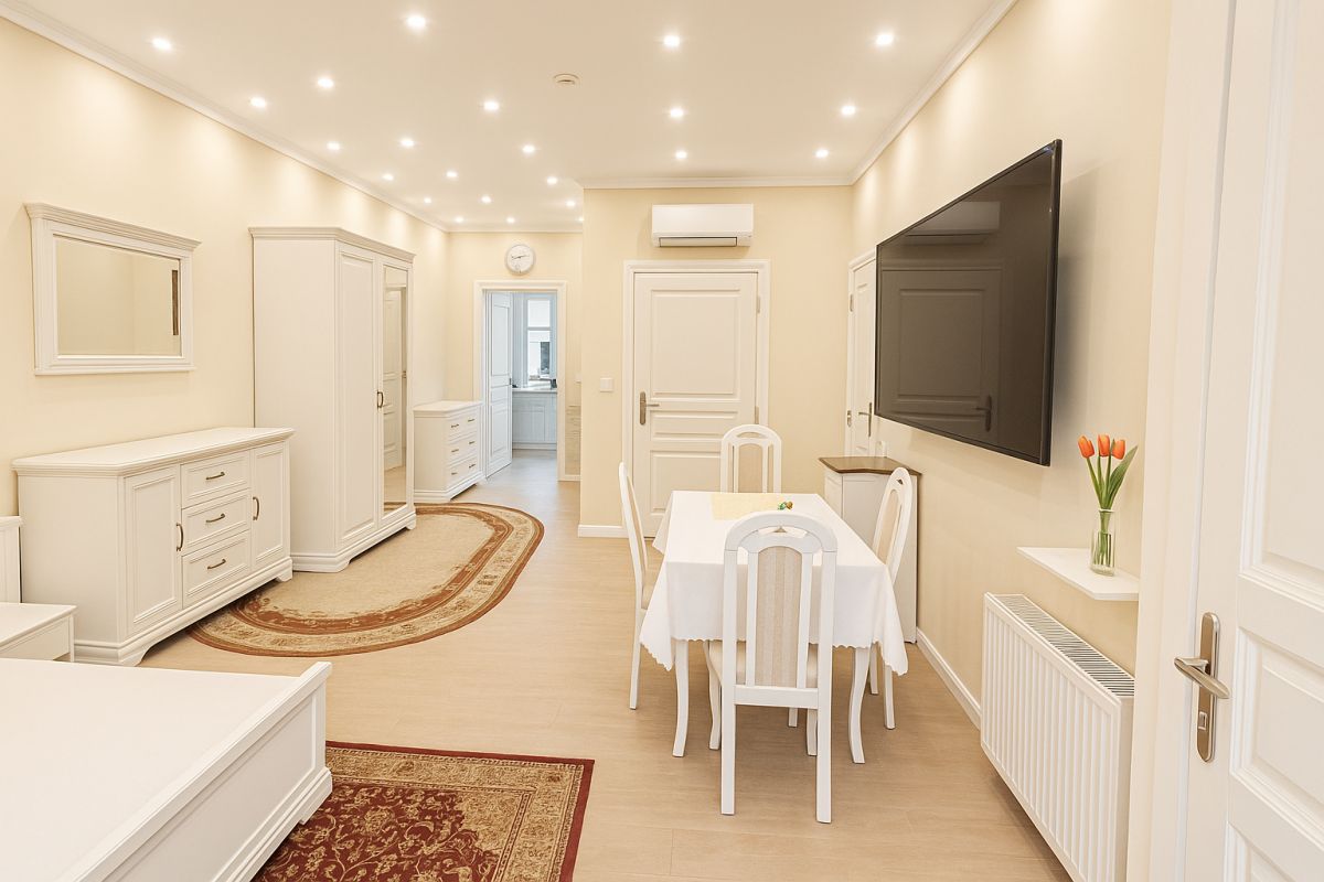 - zlokalizowane na wysokości pierwszego piętra znajduje się duże przylegające mieszkanie 2 pokoje z osobną kuchnią i łazienką. To klimatyzowany apartament o powierzchni około 120m2 o wysokim standardzie. Mieszkanie posiada osobny podjazd i osobne wejście z dwóch stron.