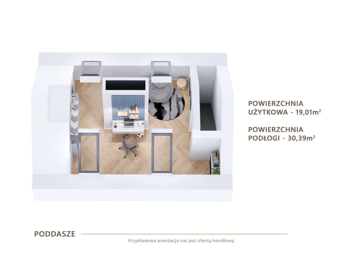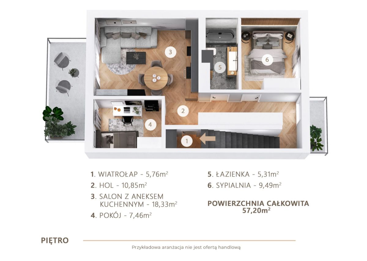 Nieruchomość o powierzchni 76,20m2 ( 57,20m2 poziom I + 19,00m2 poziom II ) składa się z salonu z aneksem kuchennym, dwóch pokojów, łazienki, holu oraz wiatrołapu.
