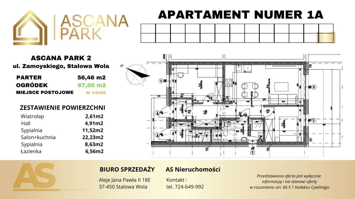 Apartament 1A na prestiżowym Osiedlu ASCANA to zdecydowanie miejsce tworzone dla osób ceniących sobie komfort i swobodę. Świetna lokalizacja, kameralna atmosfera, brak części wspólnych, funkcjonalny układ pomieszczeń oraz duży 67metrowy ogródek to tylko część atutów tej inwestycji. To Państwo decydują o przeznaczeniu nieruchomości a tym samym w jakim stylu urządzą swoją przestrzeń.