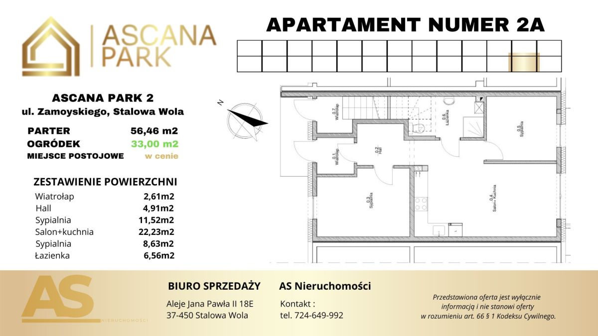 Apartament 2A na prestiżowym Osiedlu ASCANA to zdecydowanie miejsce tworzone dla osób ceniących sobie komfort i swobodę. Świetna lokalizacja, kameralna atmosfera, brak części wspólnych, funkcjonalny układ pomieszczeń oraz duży 33metrowy ogródek to tylko część atutów tej inwestycji. To Państwo decydują o przeznaczeniu nieruchomości a tym samym w jakim stylu urządzą swoją przestrzeń.