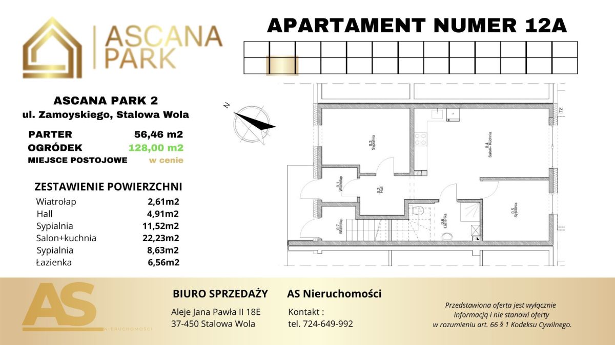 Apartament 2A na prestiżowym Osiedlu ASCANA to zdecydowanie miejsce tworzone dla osób ceniących sobie komfort i swobodę. Świetna lokalizacja, kameralna atmosfera, brak części wspólnych, funkcjonalny układ pomieszczeń oraz 128 metrowy ogródek to tylko część atutów tej inwestycji. To Państwo decydują o przeznaczeniu nieruchomości a tym samym w jakim stylu urządzą swoją przestrzeń.